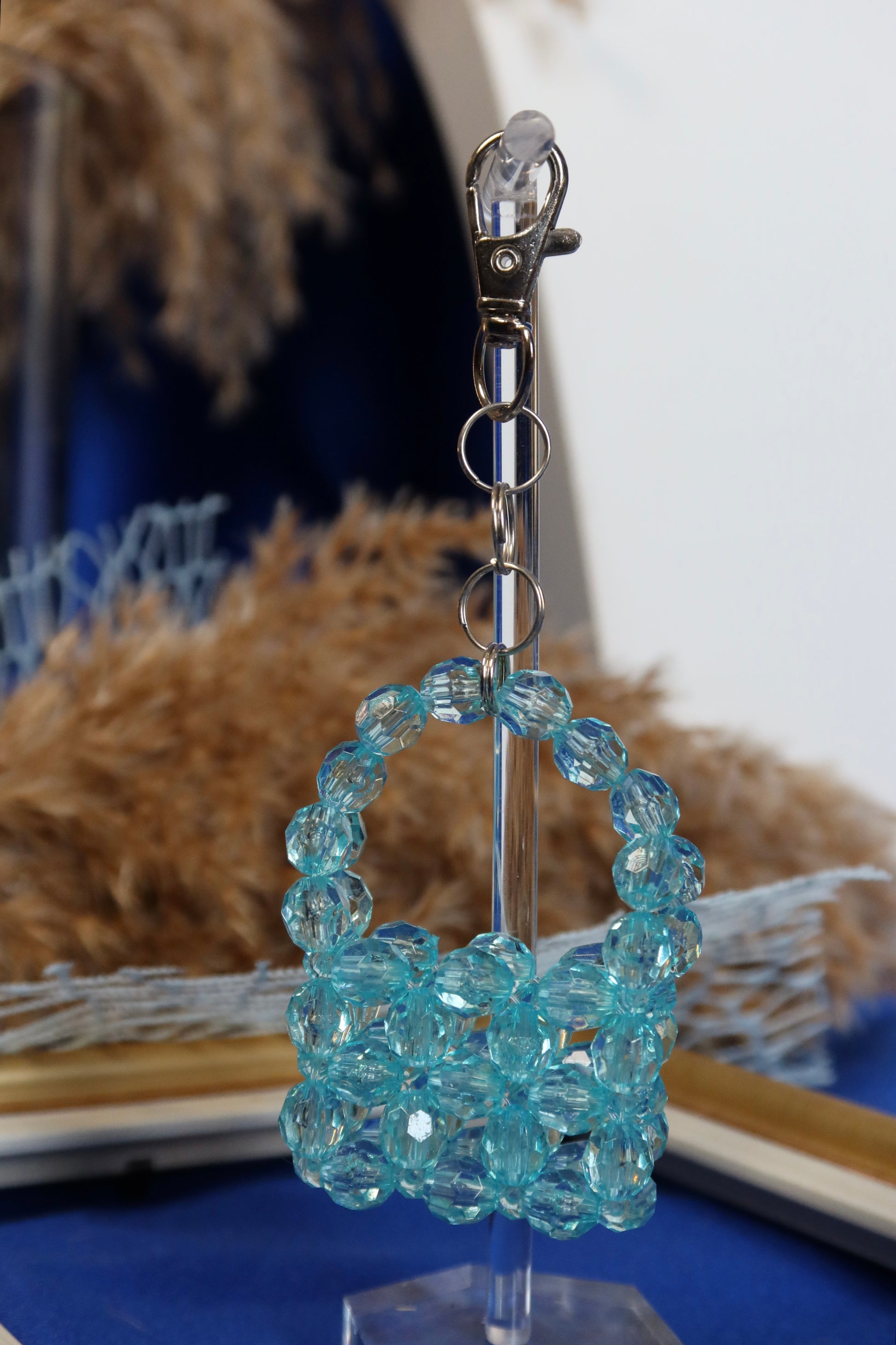 Realizzato a mano con cura, questo portachiavi a forma di borsetta in un delicato celeste unisce funzionalità e stile.